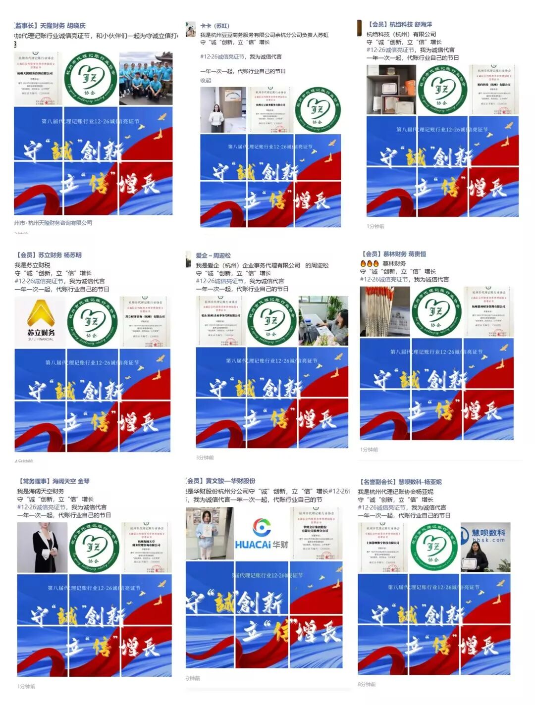 加强代理记账行业诚信建设,参与和见证行业的力量。本次诚信亮证节以“守诚创新·立信增长”为核心主题,杭州市代理记账行业协会动员会员单位,通过微信朋友圈等社交平台集中展示《代理记账行业诚信公约》。亮证内容涵盖“恪守职业道德、规范执业行为、保障客户权益、拒绝虚假宣传”等核心承诺,每一条公约都是代账人对客户、对社会作出的庄严承诺。下午三点,杭州市数百家代理记账机构同步更新朋友圈,形成“诚信亮证”的红色浪潮,与全国百万代账人共同构建起覆盖全国的诚信网络。