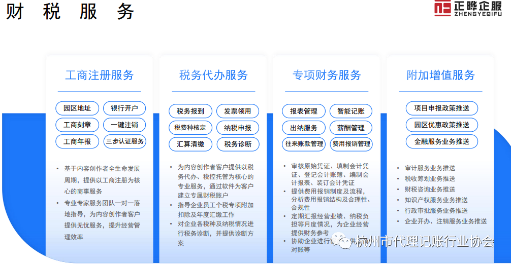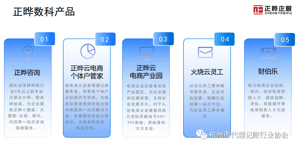 正晔数科专注于互联网电商行业财税领域,为电商从业者 提供以智能、合规、有温度的一体化财税服务为核心的一 站式企业服务。总部位于杭州,旗下包含财税科技、 产业园区、税务师事务所、 人力资源等业务,业务覆盖 全国20+城市。