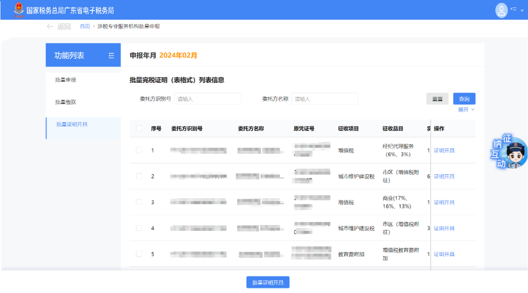 11)点击“批量证明开具”,可以批量开具税收完税证明。