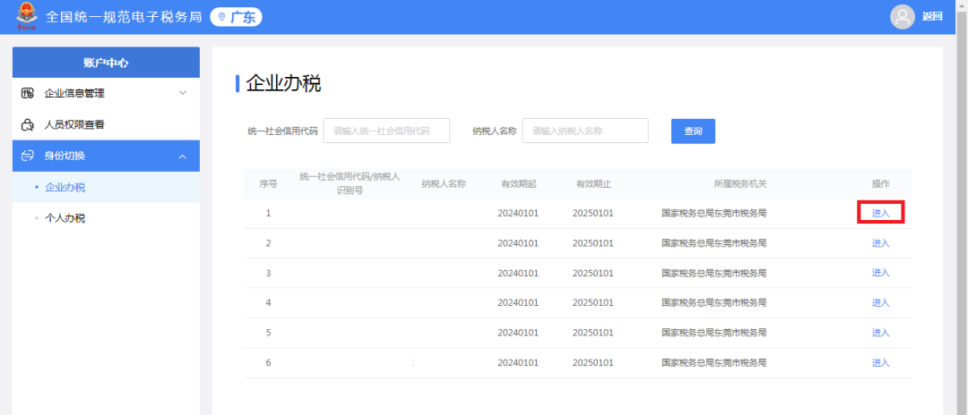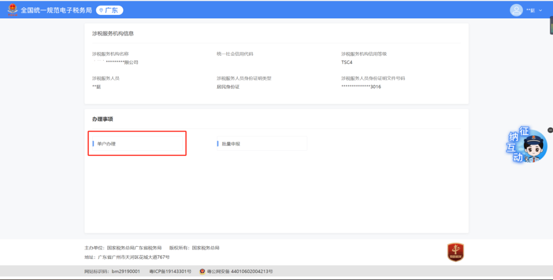 2)校验通过后系统跳转至选择被代理企业界面,点击单户办理;
