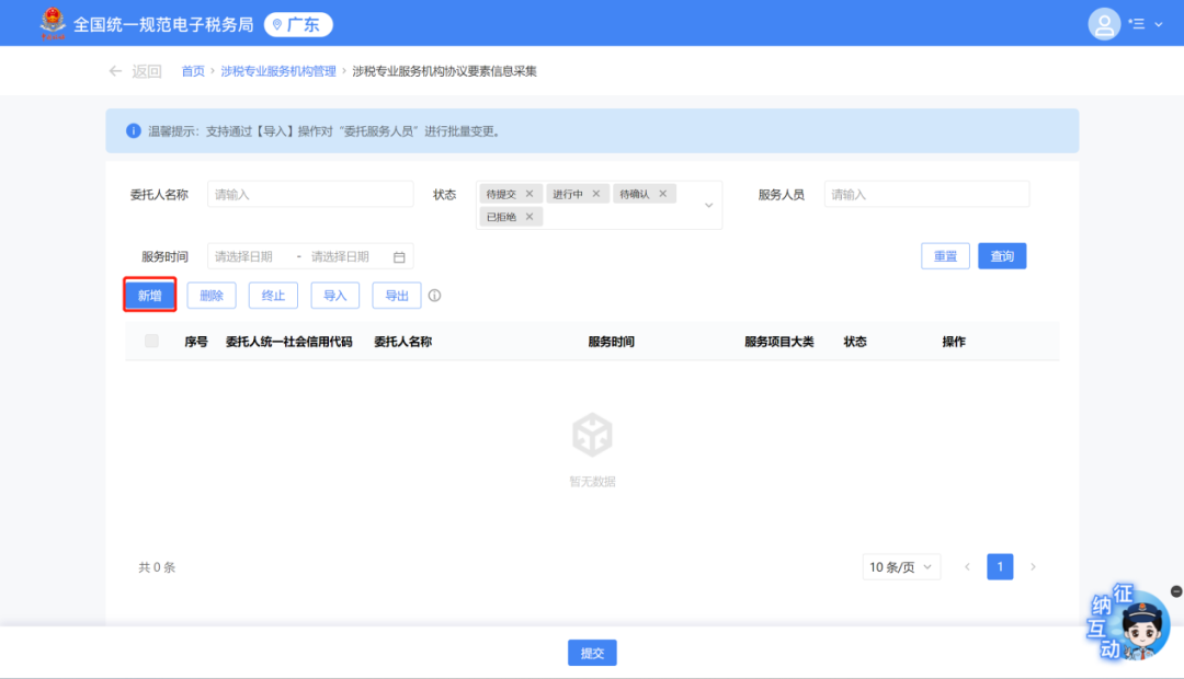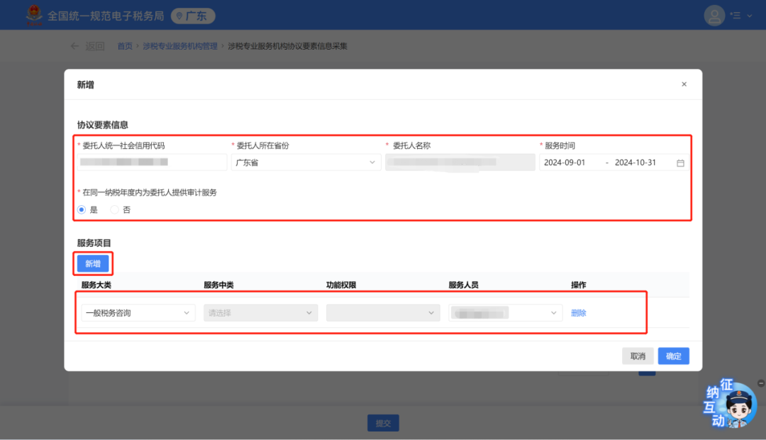 3)进入新增协议采集页面,录入委托人信息,点击“新增”,录入服务项目后,点击“确定”。