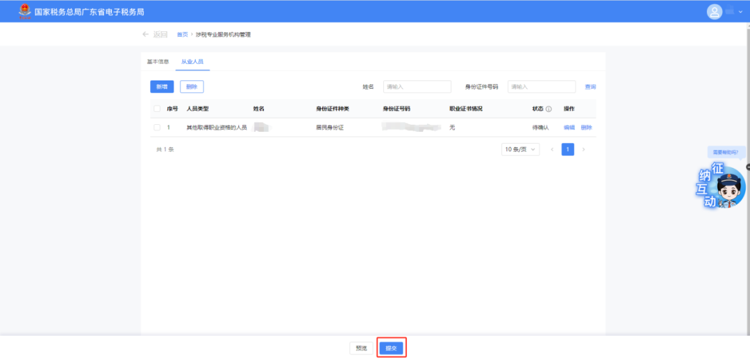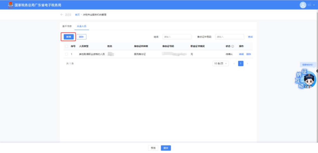 5)进入“涉税专业服务机构人员信息采集”页面。点击“新增”录入代理人员信息。