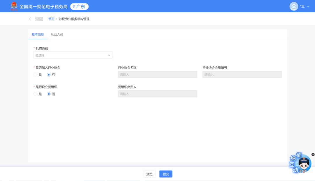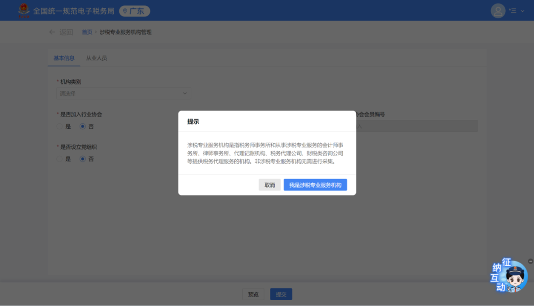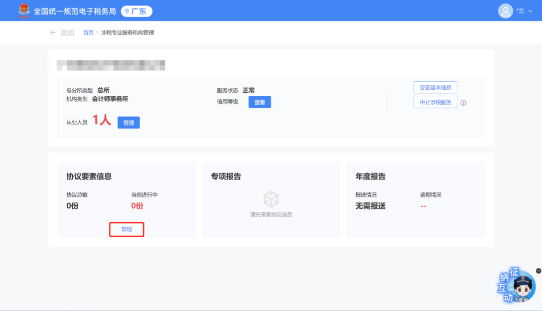 1) 进入涉税专业服务机构管理,点击协议要素信息模块“管理”按钮。