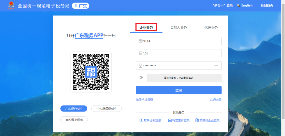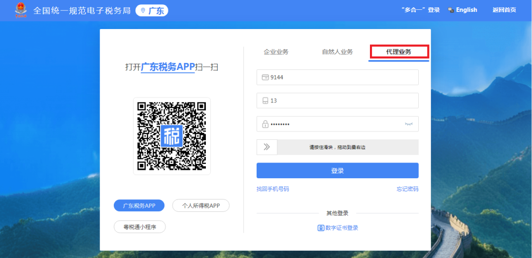 1)登录页面选择“代理业务”,输入代理企业纳税人识别号、个人身份证号码/手机号码/用户名、个人用户密码,完成滑块验证后,点击登录。