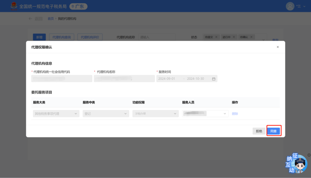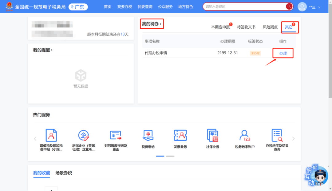 6)委托方以“企业业务”的方式登录电子局税务局后,“首页-我的待办-其他”,存在一条代理办税申请,点击“办理”,确认信息无误后,点击“同意”,即可成功签订协议。