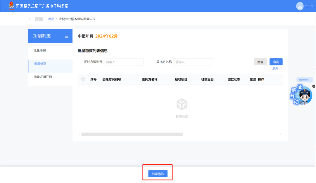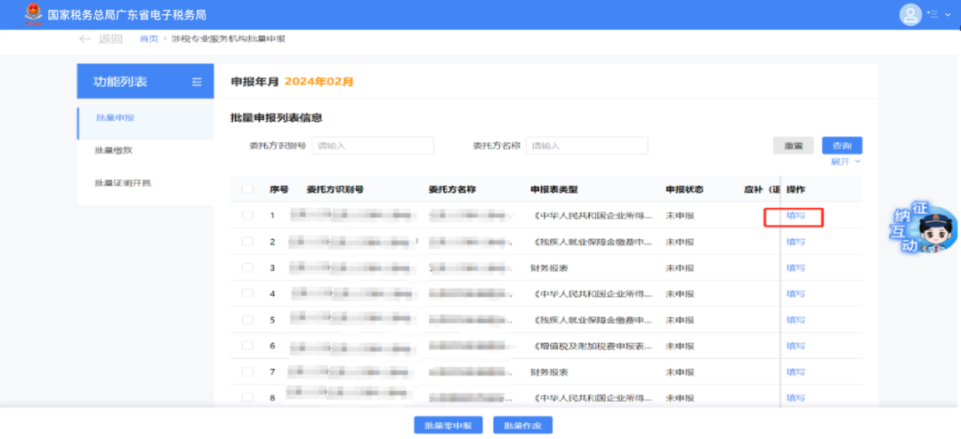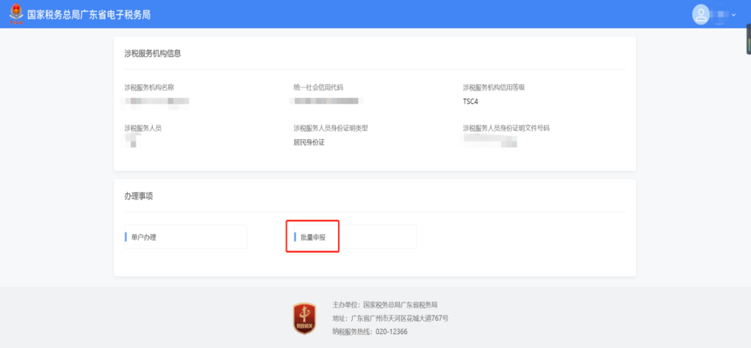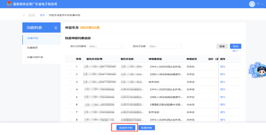 7)另外,进入“涉税专业服务机构管理”后,点击“批量申报”功能菜单,可以进行批量申报。