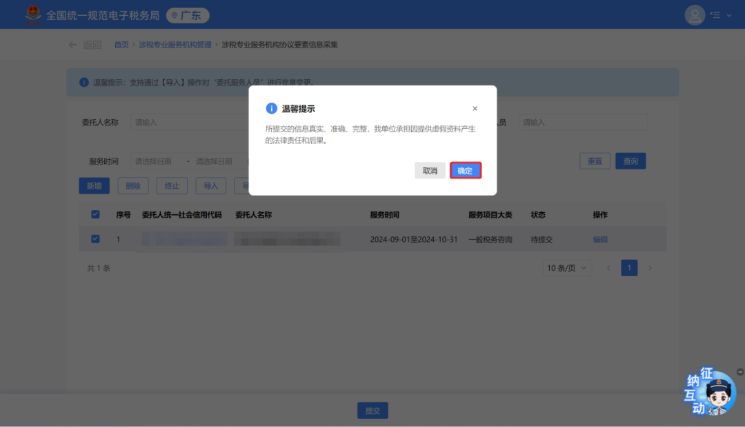 4)即可成功新增一条待提交协议信息,点击“提交”,点击“确定”,即可成功提交新协议采集。