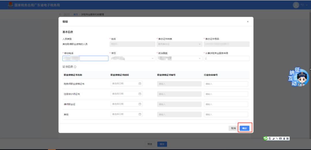 6)录入相关信息后,根据录入的资格证书上传对应的证书资料,上传完成后,点击“确定”。